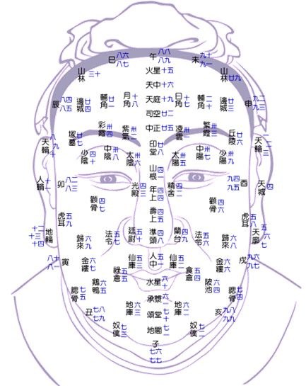 十二.法令为井灶侧之长纹。又名寿带。两法令纹入口。又名滕蛇。退一指陷处。即两陂池。其次则名金缕。又其次则名虎耳。虎耳在命门前一指。即医家之听宫穴也。归来则在虎耳金缕之间。前三部略短。后二部略宽。